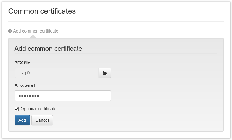 - Common certificates cannot be suspended or revoked. Their update is only possible via deleting an older PFX and adding a new one.