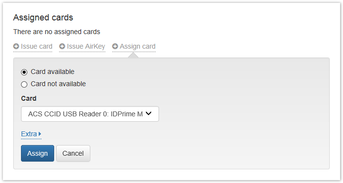 Assignment of a card to a user stipulates for that a card, already added to the system by operator, is assigned to the defined user in order he or she issued a certificate and key pair to write those to the assigned card on his/her own using the Self-Service application.