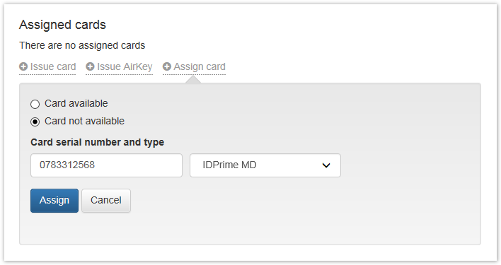 4. If the card is not available at the moment of assignment, but its serial number and type is known - enter these and click Assign button.