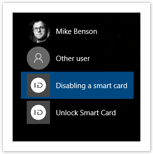 1. To deactivate a card, select Disabling a smart card item in the user selection window. The figure shows an example for Windows 10. The mechanism of smart card disabling in other Windows versions is similar to the one described.