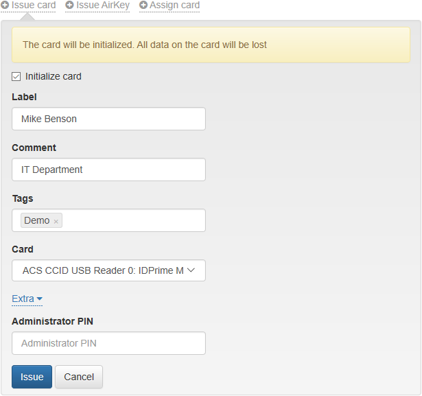Initialize card – If enabled, the card is initialized before issuance. Initialization deletes all the data stored on the card.