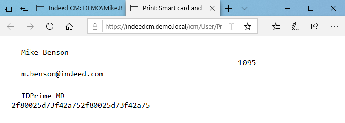7. After smart card is issued, a randomly generated user PIN is displayed, if the smart card issuance policy is set up accordingly. The set PIN can be send to the user or his/her manager e-mail (see Setting PIN in User notifications of Indeed CM smart card policy) or printed.