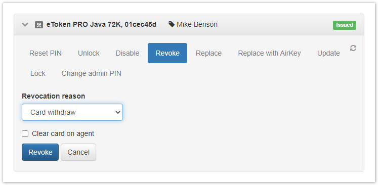 6. Click Revoke, if the card is available or creates a task on the agent by selecting the Clear card on agent option.