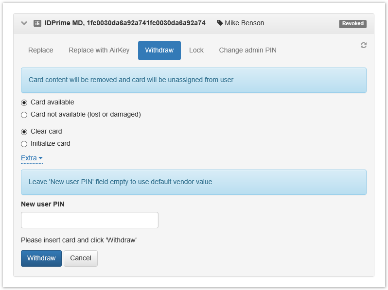The revoked smart card remains assigned to the user and can be either replaced (see Smart card replacement) or withdrawn. To withdraw a user smart card, proceed as follows: