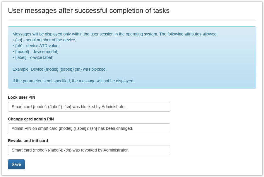 By default, the messages are not defined and are not displayed to users. To enable messages, switch to User messages section of the device usage policy and enter message texts.