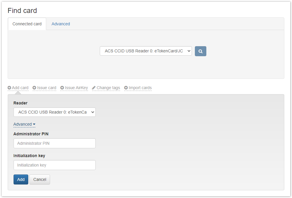 Connect the smart card to a computer, set the Administrator PIN, if required, and click Add. After adding the smart card, click Close. Smart cards can also be added automatically by connecting them one by one to the same reader.