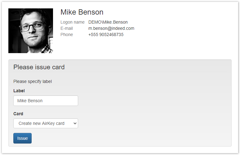 When a user logs in to Self-Service, he or she is prompted to Create new AirKey card or select a connected hardware card: