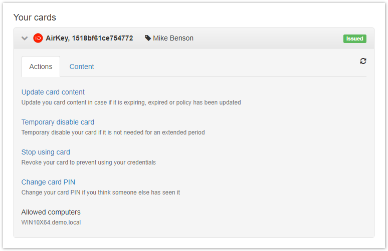 After a card is issued, it is automatically connected to the user workstation. The list of allowed computers is displayed in AirKey card properties.