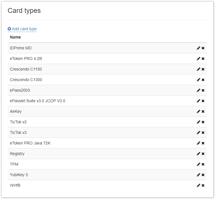 A card type file contains default predefined values of administrator and user PIN. These values can be changed after the card type file is added to Indeed CM. To edit a card type, select the required one in the list and click