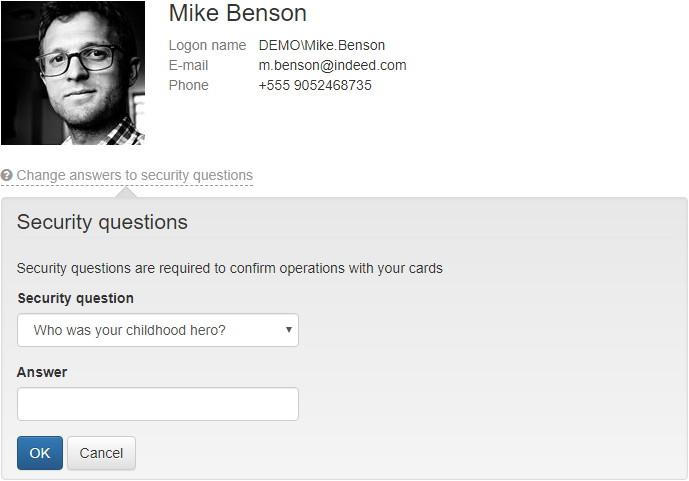 To define or modify security questions, please click Change answers to security questions. Select a question from the list and define an answer to it. To save the changes, click ОК. To reset the changes, click Cancel.