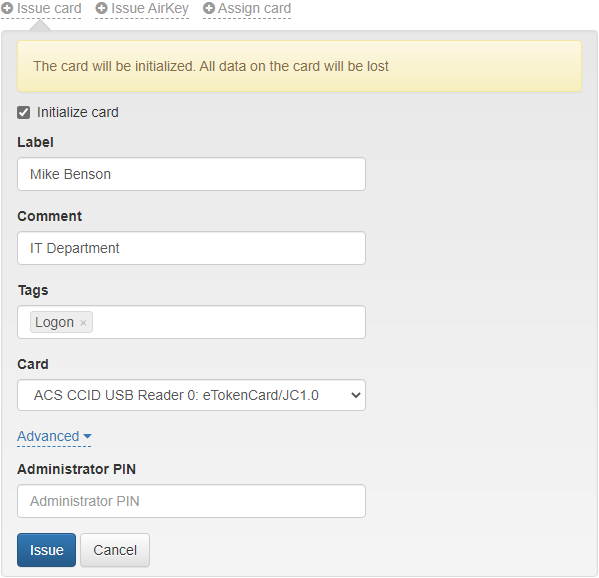 Initialize card – If enabled, the card is initialized before issuance. Initialization deletes all the data stored on the card.