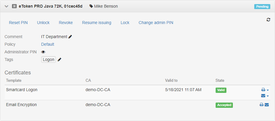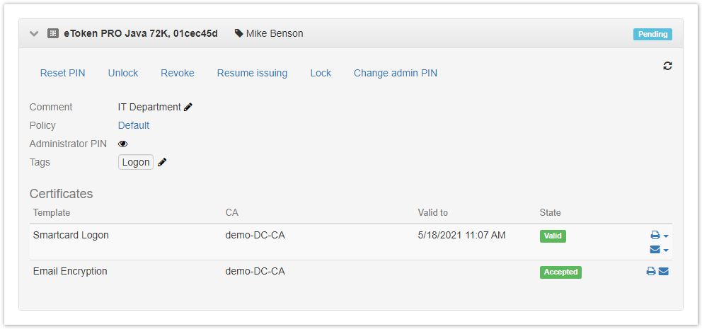 6. After approval the certificate state changes to Accepted. Then you can continue card issuance (the Resume issuing button becomes active).