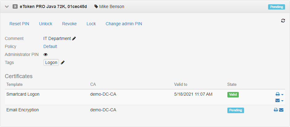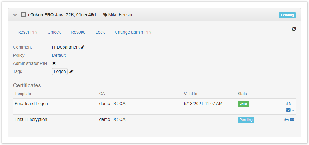 If certificate request needs to be approved by certification authority operator (see Smart card life cycle), then the request current state is displayed in the user card.