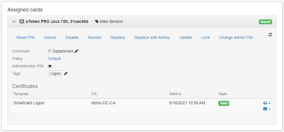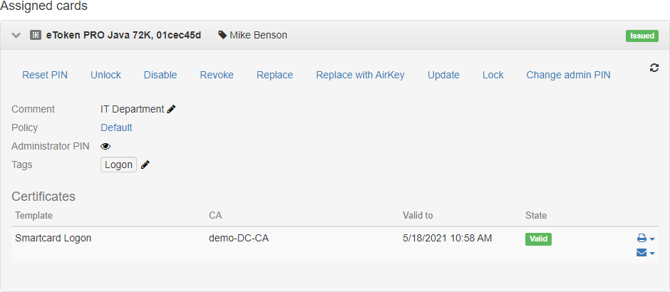 5. After the card is issued, the Assigned cards section appears in the User card, containing the information about the issued card: