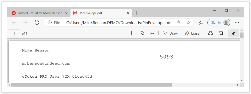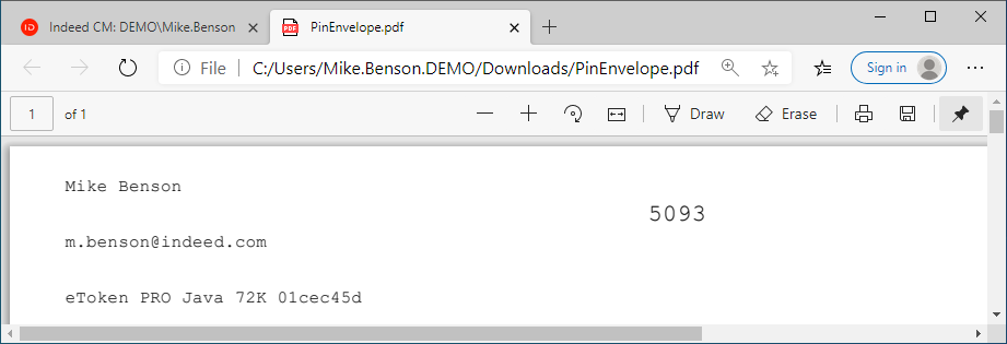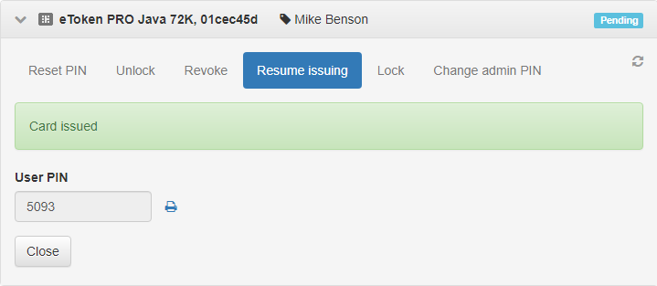 7. After smart card is issued, a randomly generated user PIN is displayed, if the smart card issuance policy is set up accordingly. The set PIN can be send to the user or his/her manager e-mail (see Setting PIN in User notifications of Indeed CM smart card policy) or printed.