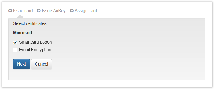 During the issue procedure, the smart card is personalized for the user: the card is initialized, key pairs are generated, required certificates are enrolled and the all these are written to the smart card according to the defined usage policy.