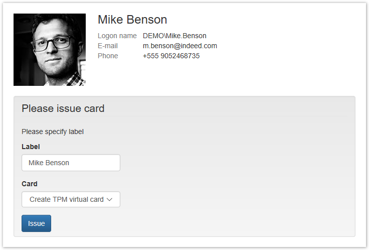 After clicking the Issue button, Indeed Certificate Manager will create the TPM virtual card and assign it to the user. The TPM virtual card can be used just like hardware smart cards on the user's workstation. For example, for authentication in a domain.