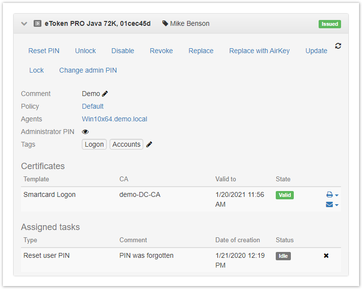 Agents carry out smart card and content management via tasks. If a task does not require user participation, then it can be executed by any Agent. Otherwise it can be performed only by assigned agent - for example, when answer to security questions is required to unlock the smart card.