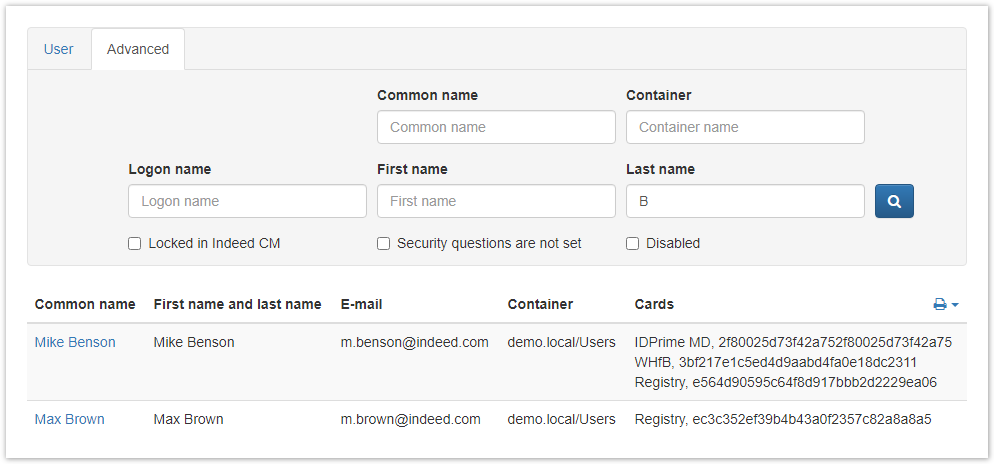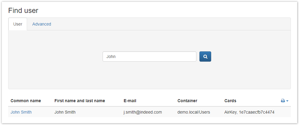 User properties (User card) can be displayed by clicking the user Common name (CN) in the search results. User search results can be saved to file. To create a file with search results, click