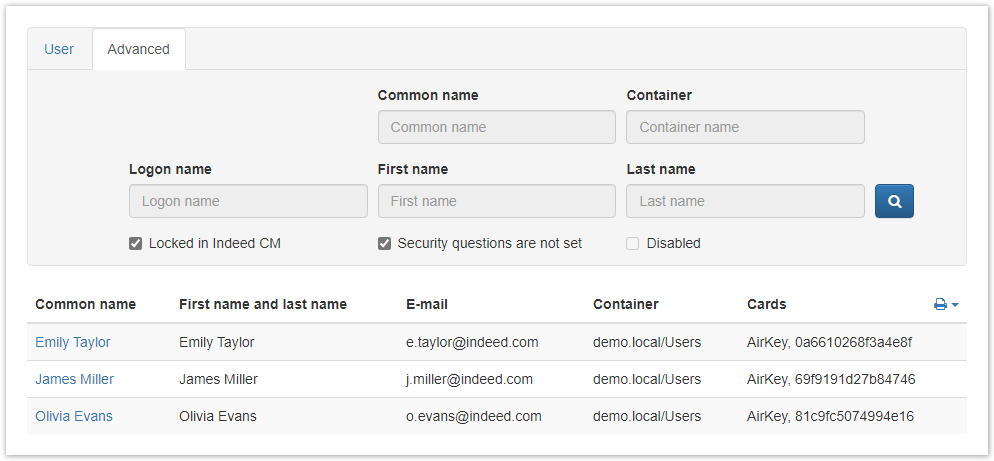 1. Standard search is performed by characters entered into the search field: Common name, Logon name (sAMAccountName), First name, Last name or E-mail address. To view all users of the directory, enter * character in the search field.