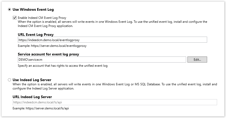 - Select Use Indeed Log Server if the unified event log is configured via the Indeed Log Server application and specify: