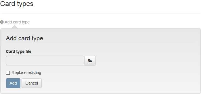 To add a card type, click Add card type, specify the card type file and click Add. If it is necessary to replace an existing card type file, then activate the Replace existing option. Files for various card types are supplied along with installation package of Indeed CM Server.