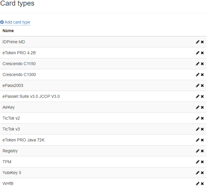A card type file contains default predefined values of administrator and user PIN. These values can be changed after the card type file is added to Indeed CM. To edit a card type, select the required one in the list and click