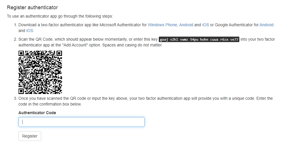 - Enter the obtained value to Authenticator Code field at the registration pageĀ