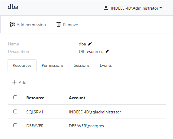 The section is intended for grouping resources in order to quickly and conveniently issue permissions to the entire group at once, as well as view sessions and events in the group as a whole.