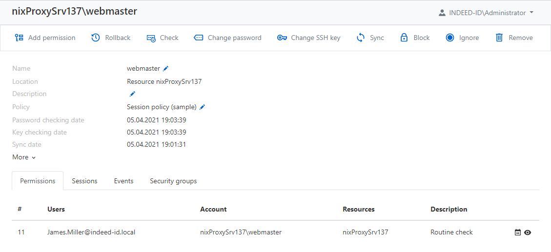 - Account - the account used to start RDP, SSH or web session at the resources specified in the permission.