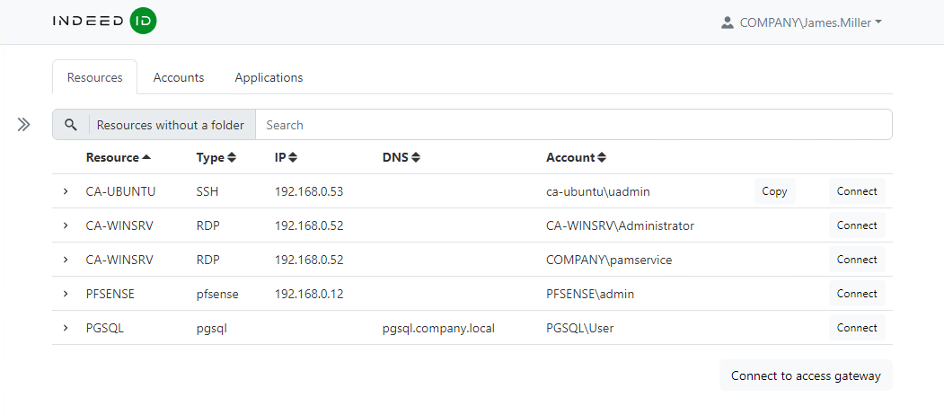 Access to resources is performed using .rdp files. To download the file, you must click Connect to the right of the required permission or click Connect to the access gateway. The second connection option is convenient with a large number of permissions, since it allows you to select the desired resource after authentication.
