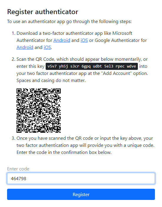 - Enter the obtained value to Authenticator Code field at the registration page