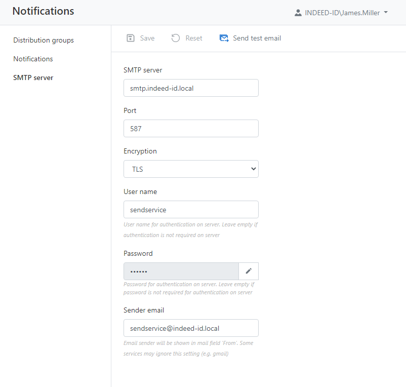 At first, specify the mail settings: go to the SMTP server section, enter the mail server address, port, authorization credentials and save the changes.
