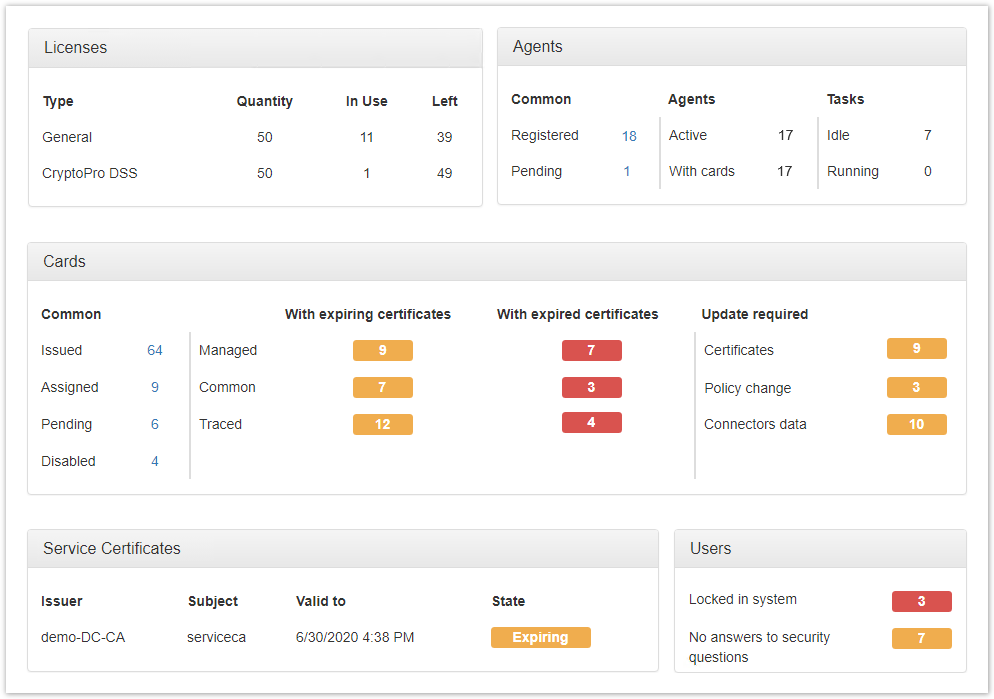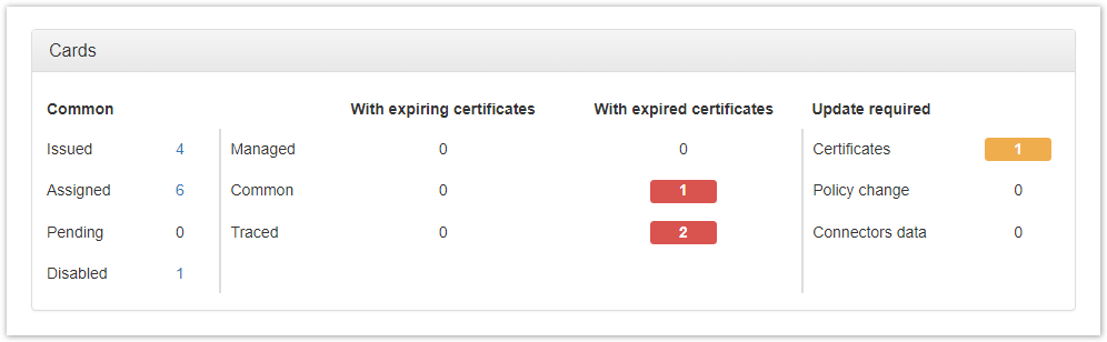 Number of cards by content status (with expiring and expired certificates):