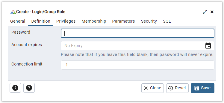 5. On the Definition tab enter your password in the Password field. No Expiry must be specified in the Account Expires field.