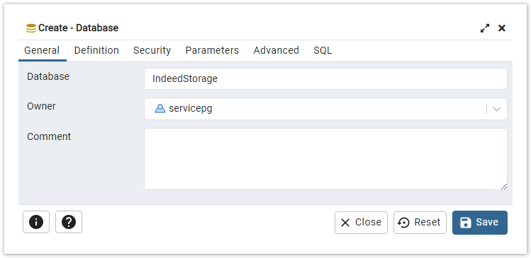 - Enter name in the Name field on General tab, for example IndeedStorage. Select the user in the Owner list, created on the first step of this guide (servicepg) and click Save.