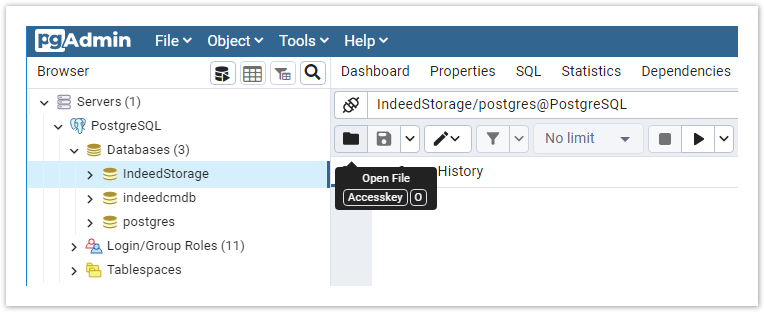 Image Modifiedin the Query Tool menu and specify the path to the file Storage-Postgre.sql (it is located in \IndeedCM.Server\Misc) and click Select