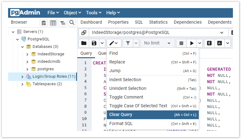 2. Select the database (IndeedStorage) in Browser secion and execute the Storage-Postgre.sql script: