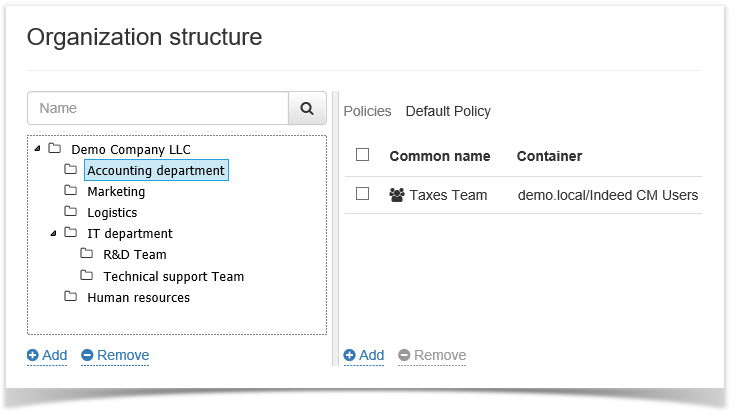 Smart cards are issued to users in Indeed Certificate Manager according to defined rules. Smart cards usage rules are defined in the policies that apply to the scope specified. The rules are, for example, initialization need, issue settings, user authentication parameters etc. A policy scope is an object of user directory. It can be, say, an Active Directory domain unit. With Organization structure it is possible to unite the objects of user directory under a single smart card usage policy.