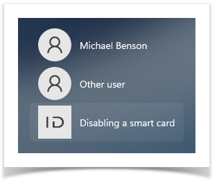 - To deactivate a card, select Disabling a smart card item in the user selection window. The figure shows an example for Windows 10. The mechanism of smart card disabling in other Windows versions is similar to the one described.