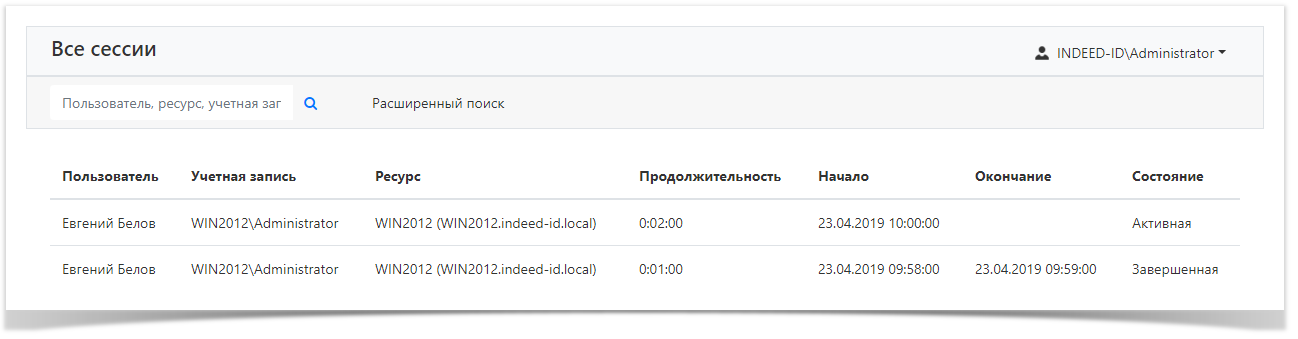 Раздел предназначен для поиска и просмотра активных и завершенных сессий.