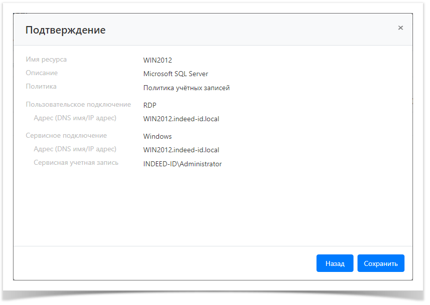 Note icon false Если в качестве сервисной планируется использовать локальную учётную запись ресурса, то настройку можно пропустить и вернуться к ней после добавления учётной записи для ресурса. Если в Indeed PAM добавлен домен Active Directory, то в качестве сервисной можно использовать доменную учётную запись.