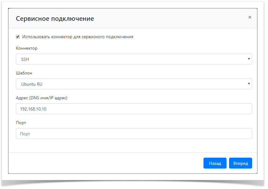 Note icon false По умолчанию в списке отсутствуют шаблоны для сервисного подключения SSH, процесс создания и настройки нового типа подключения описан в разделе Конфигурация.