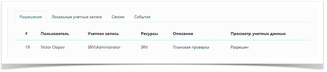 - Ресурсы - ресурсы, на которых может быть открыта RDP, SSH или web-сессия от имени учётной записи, указанной в разрешении.