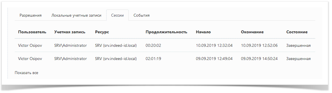 - Ресурс - ресурс, на котором была открыта RDP, SSH или web-сессия от имени учётной записи.