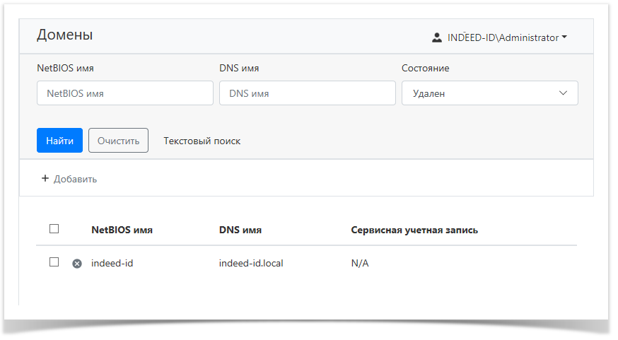Перед удалением домена необходимо удалить из Indeed PAM все доменные учётные записи доступа, которые были добавлены. |