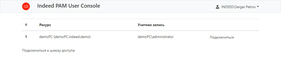 Получение доступа к ресурсам выполняется при помощи специальной оболочки для Indeed PAM Core, консоли пользователя. Доступна по следующему URL:
