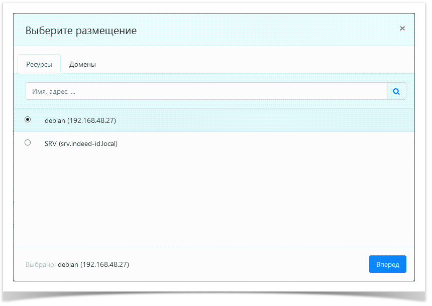 Для поиска введите Имя ресурса или Адрес (DNS адрес/IP адрес) полностью или частично. - Доменная учётная запись