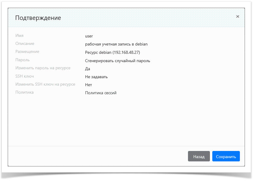Note icon false Опции Сгенерировать новый SSH ключ или Задать SSH ключ вручную + Изменить SSH ключ на ресурсе могут быть использованы только при наличии сервисного подключения. Если выбрана опция Задать SSH ключ вручную без Изменить SSH ключ на ресурсе, то SSH-ключ учётной записи будет изменён только в Indeed PAM.