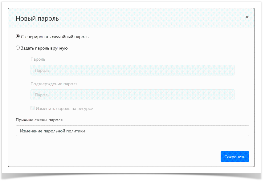 Note icon false Опции Сгенерировать случайный пароль или Задать пароль вручную + Изменить пароль на ресурсе могут быть использованы только при наличии сервисного подключения. Если выбрана опция Задать пароль вручную без Изменить пароль на ресурсе, то пароль учётной записи будет изменён только в Indeed PAM.